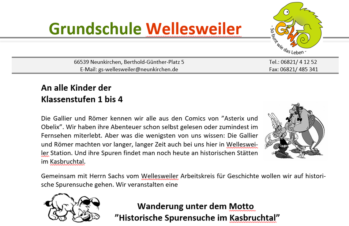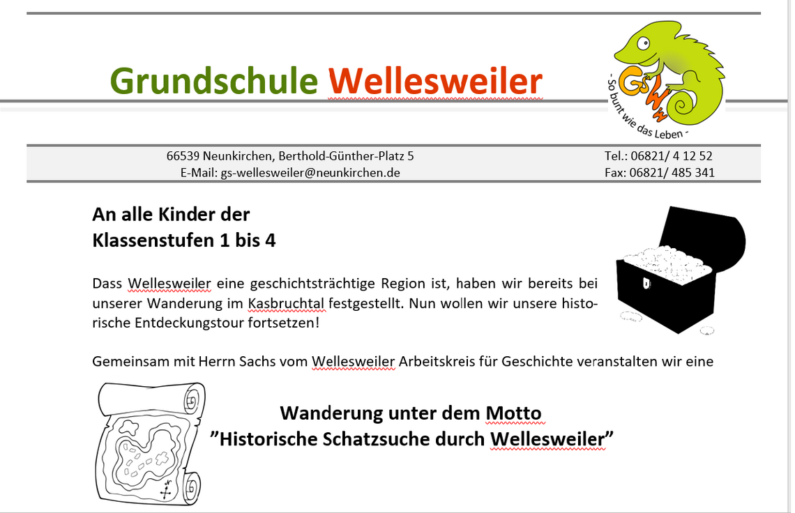 Gemeinsam mit dem Wellesweiler Arbeitskreis für Geschichte, Landeskunde und Volkskultur e.V. hat die Grundschule Wellesweiler tolle Angebote zur Historie des Stadtteils entwickelt. Die Kinder suchen die Schätze der Vergangenheit oder sie erfahren, was die Gallier und Römer mit ihrem Stadtteil zu tun haben. Bei spannenden Themenwanderungen tauchen Kinder altersgerecht in die Geschichte ein: