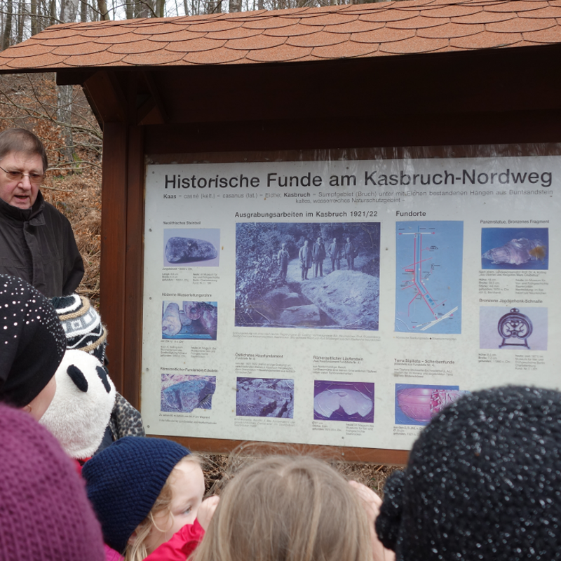 Die Kinder erkunden die Orte, an denen die Römer und Gallier früher einmal im Kasbruch gelebt und gearbeitet haben. Sie entdecken Überreste einer alten römischen Eisenschmiede und einen römerzeitlichen Steinbruch. Nach einer kleinen Pause an einer Felsenbank führt die Wanderung an einem gallo-römischen "Opferstein" vorbei und über die Jungferntreppe zu den ehemaligen Felsengräbern.